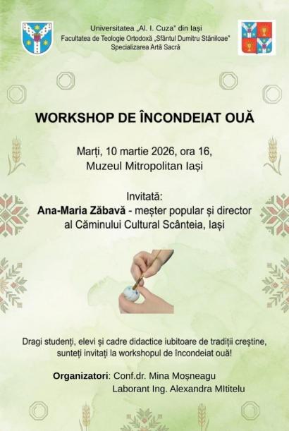 Invitata Ana Maria Zăbavă, meșter popular și director al Căminului Cultural Scânteia, va iniția studenții specializării Artă Sacră de la Facultatea de Teologie Ortodoxă ”Sfântul Dumitru Stăniloae” din Iași, în tainele încondeiatului cu ceară, în tehnica tradițională. Oul devine, an de an, suport pentru pictarea simbolurilor din viața creștinilor, dar și mesager, peste timp, al gândurilor și rugăciunilor lor.